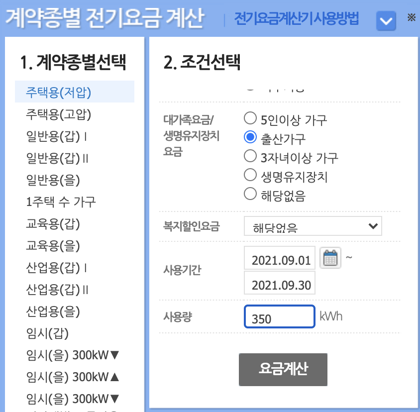 사용기간은 9월 한달로 두고, 사용량을 위에서 가정한 것처럼 350 kWh 사용했다고 선택해봤습니다.