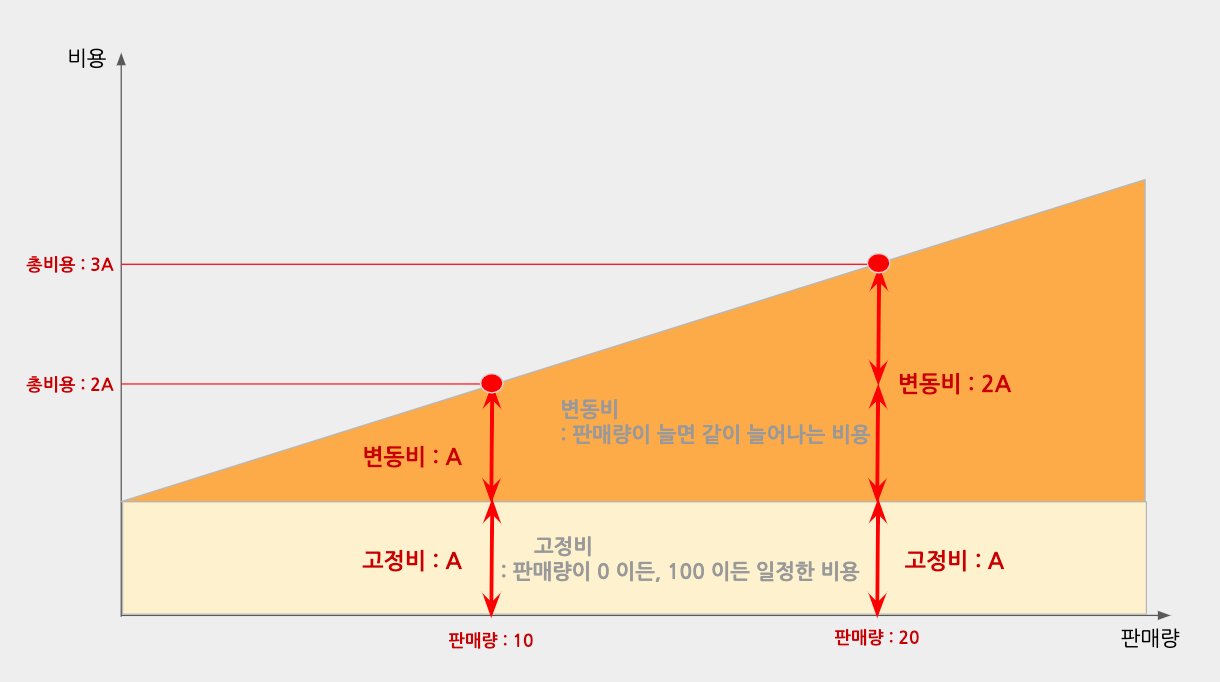 비용을 구분하는 관점 중에 "총비용 = 변동비 + 고정비"로 보는 관점이 단순하면서도 의미 있다. 이를 좀 전의 이익 계산에 둬보면 아래와 같다.